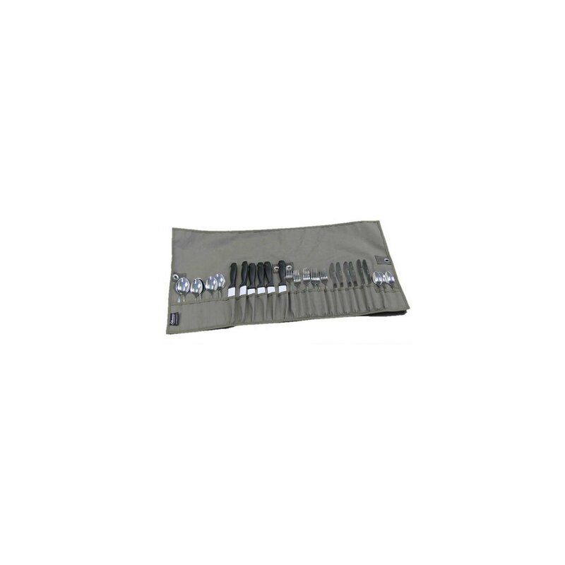 Die Canvas-Rolle hat spezielle Einstecktaschen, um das Besteck zu sichern. Eine große Klappe, die über dem Besteck liegt, verhindert ein Ausfallen des Bestecks.