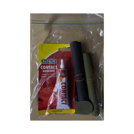 Das Set besteht aus mehreren runden Canvas-Reparaturflicken für kleinere Löcher, enthält aber auch ein etwas größeres olivfarbenes sowie ein schwarzes Canvas-Stück (15 x 20 cm). Außerdem enthält es einen kleinen als auch größeren Moskitonetz-Reparaturstreifen. Dem Set liegt zudem eine spezielle Klebstofftube bei.