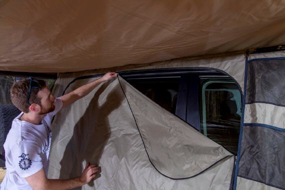 Es wird jeweils vorne und hinten an den Markisen-Aluschienen (am Fahrzeug bzw. am Markisenende) in eine Kederschiene eingezogen und an den seitlichen Markisen-Tragarmen einfach nur eingeclipst. Dadurch hängt das Zelt sicher und stabil unter der Markise.