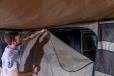Das Markisenzelt besteht aus zwei Schichten: Außen schützt ein Polyurethan beschichtetes 300D Polyester-Gewebe (Oxford) vor Wettereinflüssen, das zudem Privatsphäre bietet. Dahinter hält ein Moskitonetz die Plagegeister fern. Beide Schichten können Sie unabhängig voneinander auch separat aufwickeln.
