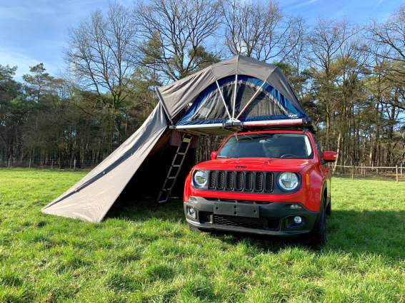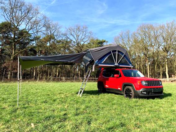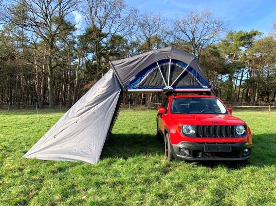Besonders bei Regen bietet diese Markise Vorteile, denn auch der Eingangsbereich des Dachzeltes wird zusätzlich geschützt.