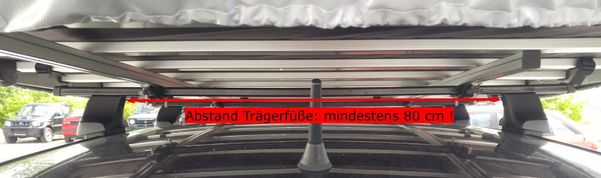 Sollte der Abstand zwischen den Dachträgerfüßen Ihres Fahrzeugs weniger als 80 cm betragen, können Sie unsere Adapterplatten montieren: Adapterplatten Dachzeltbefestigung
