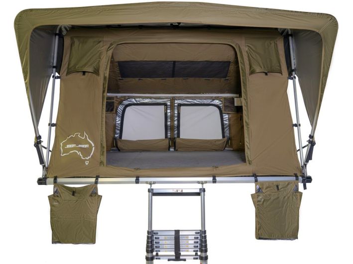 Für das Jimba Jimba 3.0 Dachzelt ist verschiedenes Zubehör erhältlich. Unter anderem gibt es drei Möglichkeiten, den Wohnraum zu erweitern. Die Markisen und die Vorzelte sind an der vorhandenen (kurzen) Markise des Dachzeltes befestigt. Dies hat den Vorteil, dass auch bei niedrigeren Autos ein hoher Wohnraum entsteht.