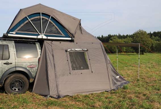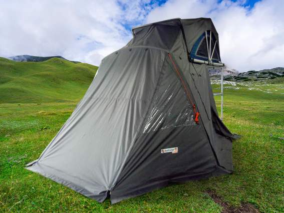 Das geräumige Vorzelt für das YUNA von Sheepie hat eine Grundfläche von etwa 3,5 x 4 Meter. Es bietet genügend Raum etwa für ein zusätzliches Feldbett oder eine Matratze bzw. Platz für den Hund aber auch einen Campingtisch samt Campingstühlen. Das Vorzelt eignet sich für Montagehöhen von 1,70 bis 2,10 Meter und passt deshalb auch ideal auf SUVs, Geländewagen und höhere Pkw.