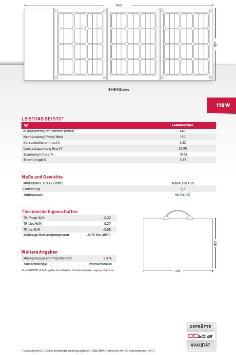 Das Datenblatt zum Solarmodul faltbar von Solara mit 110 W.