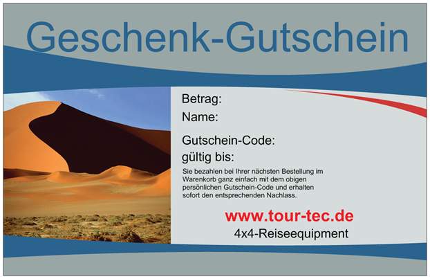 Wertgutscheine: Jede Menge Geschenkideen rund ums Offroaden und Fernreisen und Sie können sich nicht entscheiden? Verschenken Sie doch Wertgutscheine. Die Gutscheine werden mit einem Code versehen und können damit jederzeit bequem in unserem Online-Shop eingelöst werden. Ein garantiert treffsicheres Geschenk!