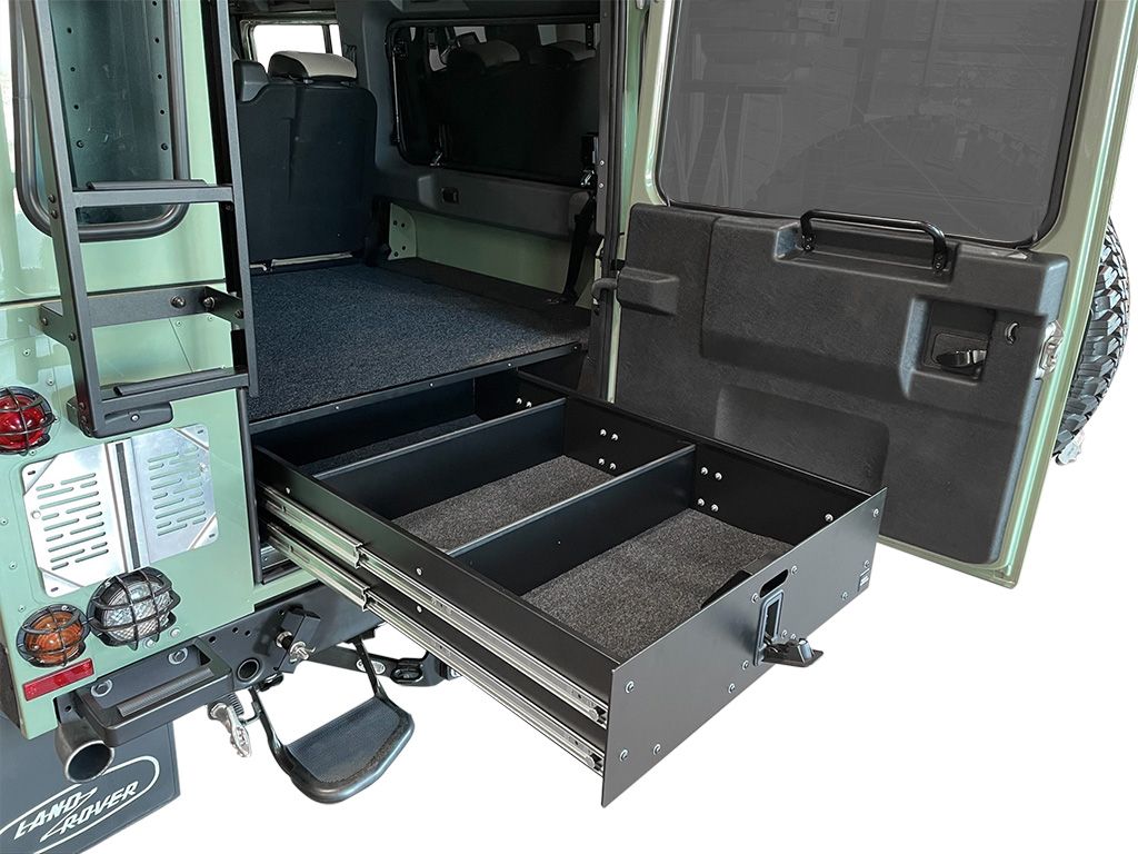 Dieses von Front Runner entwickelte Einzel - Schubladensystem wurde speziell für den Land Rover DEFENDER (2007 - 2016) / Suzuki Jimny (1998 - 2018) konzipiert. Das Schubladensystem passt in den hinteren Teil des Fahrzeugs. Das Schubfach füllt den Raum zwischen den Radkästen.