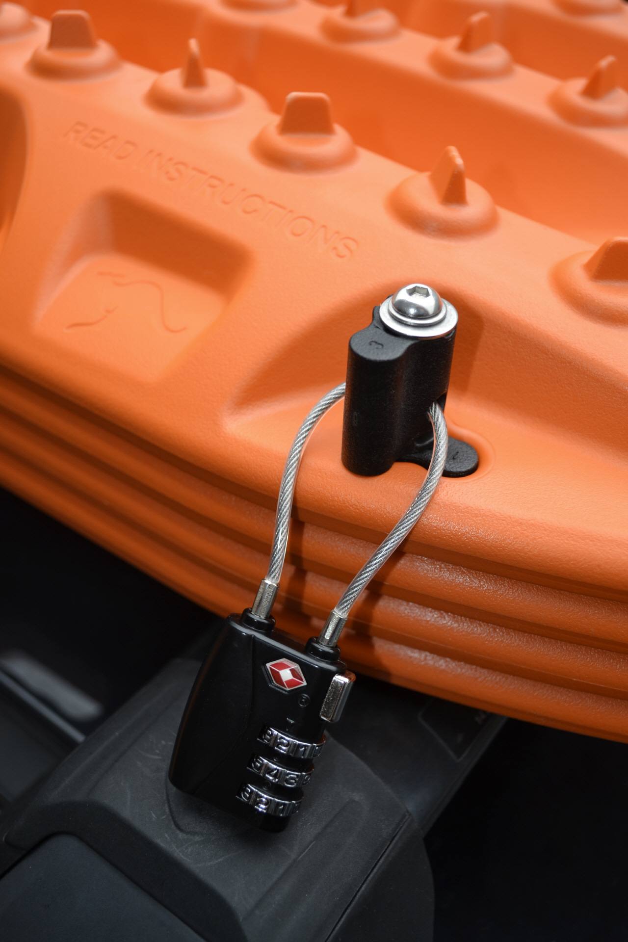 An den Spitzen der einzelnen Halterungen ist ein Loch für ein Vorhängeschloss (nicht inbegriffen) vorhanden. Damit können Sie Ihre Maxtrax auch leicht und effizient gegen Diebstahl absichern.